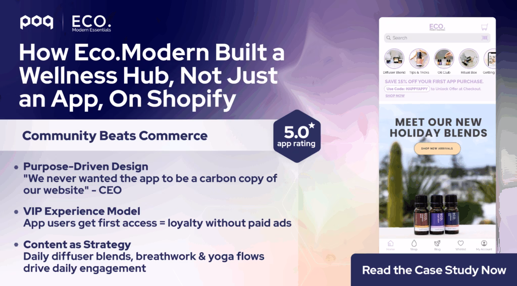 Eco.Modern, a 15-year-old Australian essential oils and wellness company, partnered with poq in 2022 to launch a mobile app that transformed their direct-to-consumer strategy. By prioritizing community building over pure commerce, they created a wellness hub that serves as the cornerstone of their holistic marketing approach.